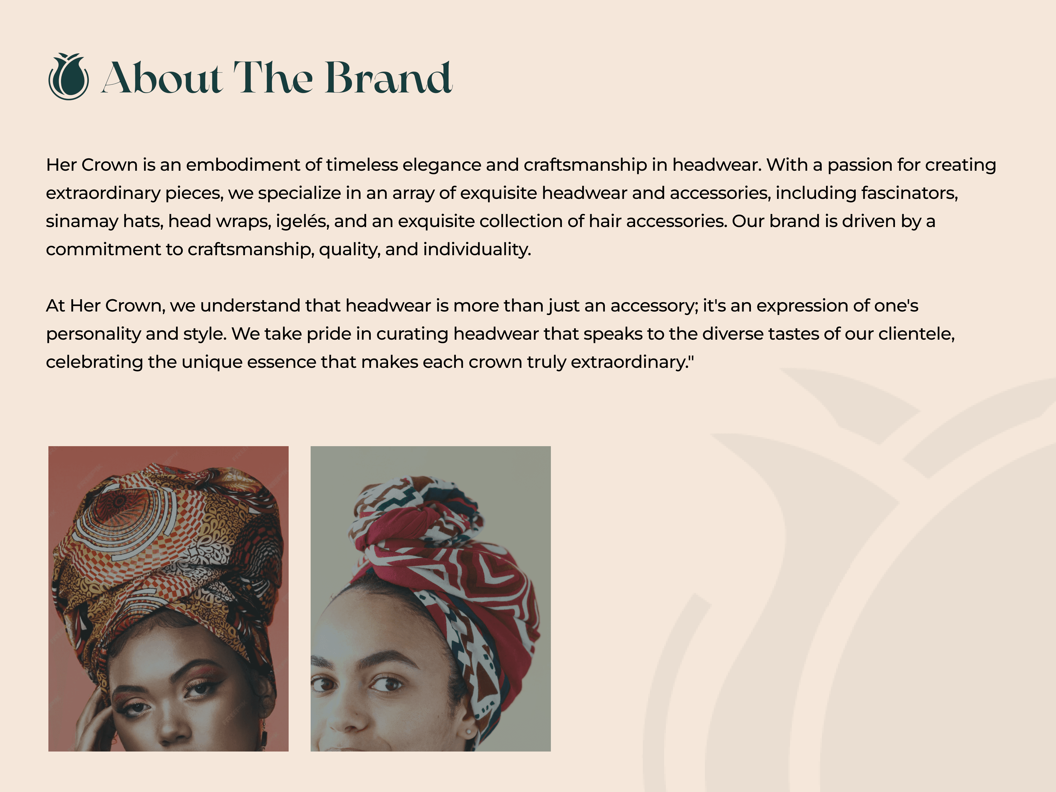 At Her Crown, we understand that headwear is more than just an accessory; it's an expression of one's personality and style. We take pride in curating headwear that speaks to the diverse tastes of our clientele, celebrating the unique essence that makes each crown truly extraordinary."