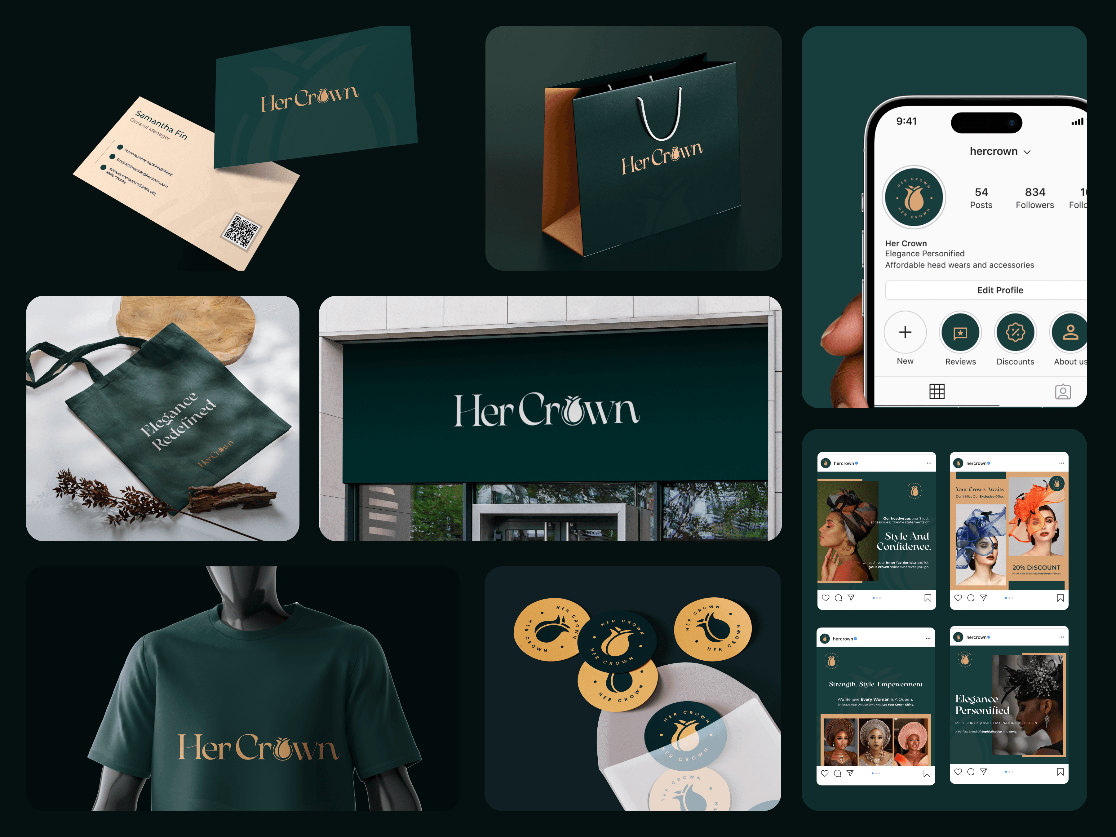 Worked on the brand identity design for Her Crown, a headwear brand that celebrates elegance, individuality, and timeless craftsmanship.