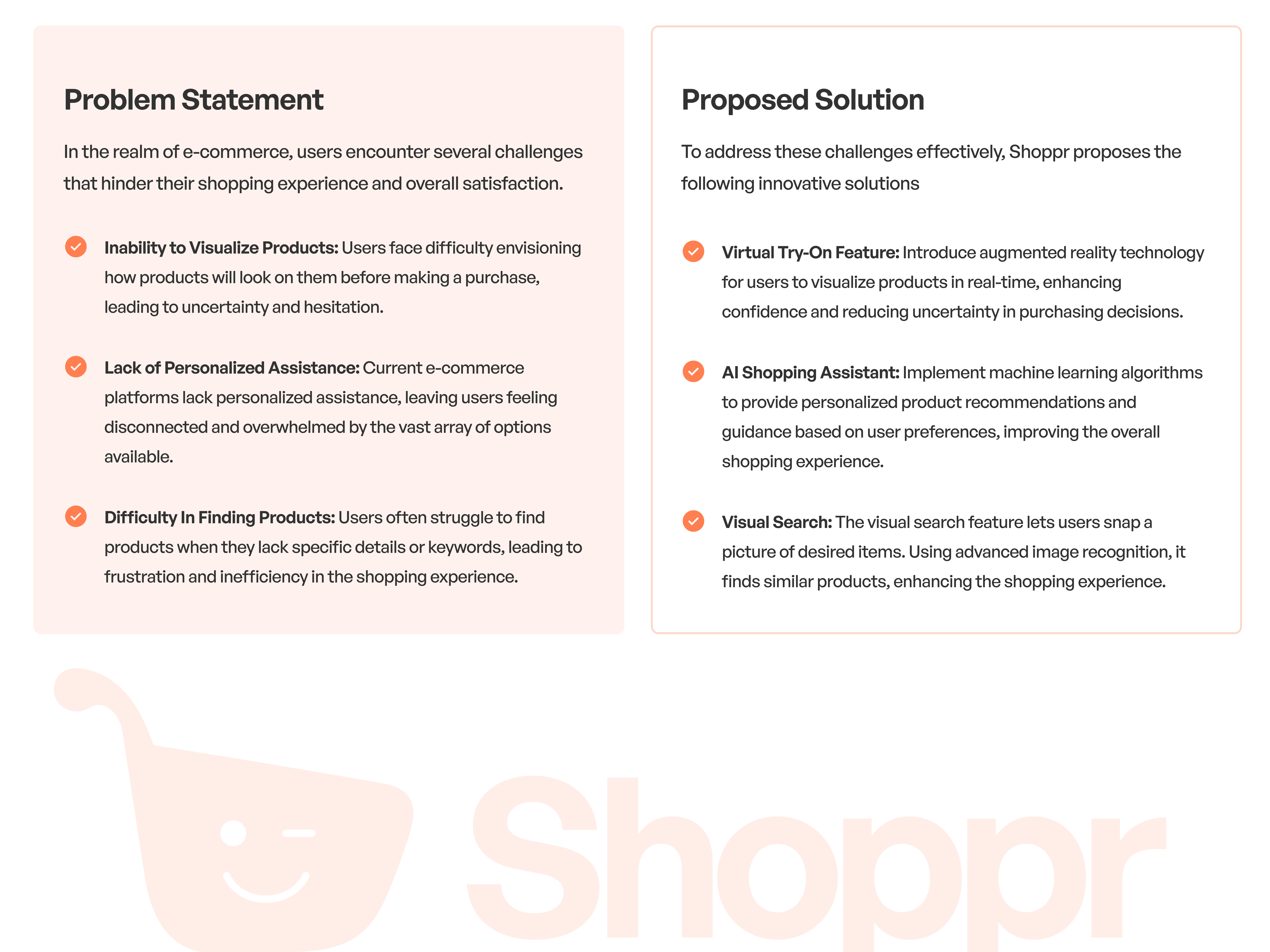 Shoppr is an e-commerce platform that leverages on advanced AI algorithms to make the online shopping experience more convenient and user friendly. This app provides tailored product recommendations, streamlined decision-making processes, and immersive virtual try-on experiences, empowering users to make informed purchasing decisions with ease.