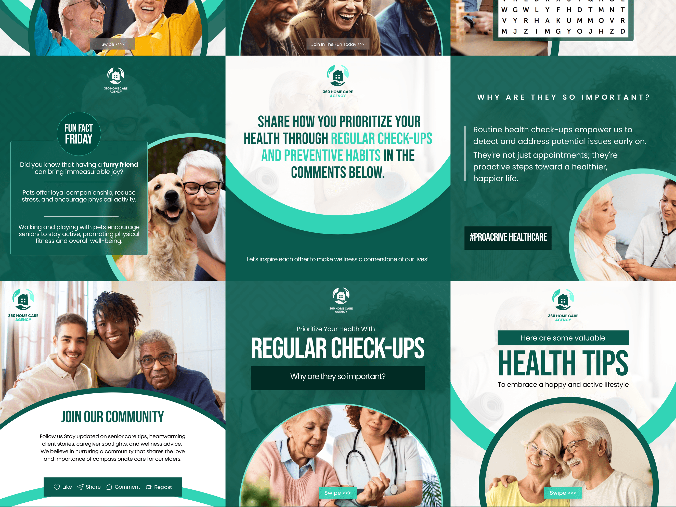 I worked on these social media designs for 360 Home care agency - A health care brand dedicated to providing compassionate, reliable, and personalized care for seniors and individuals in need.