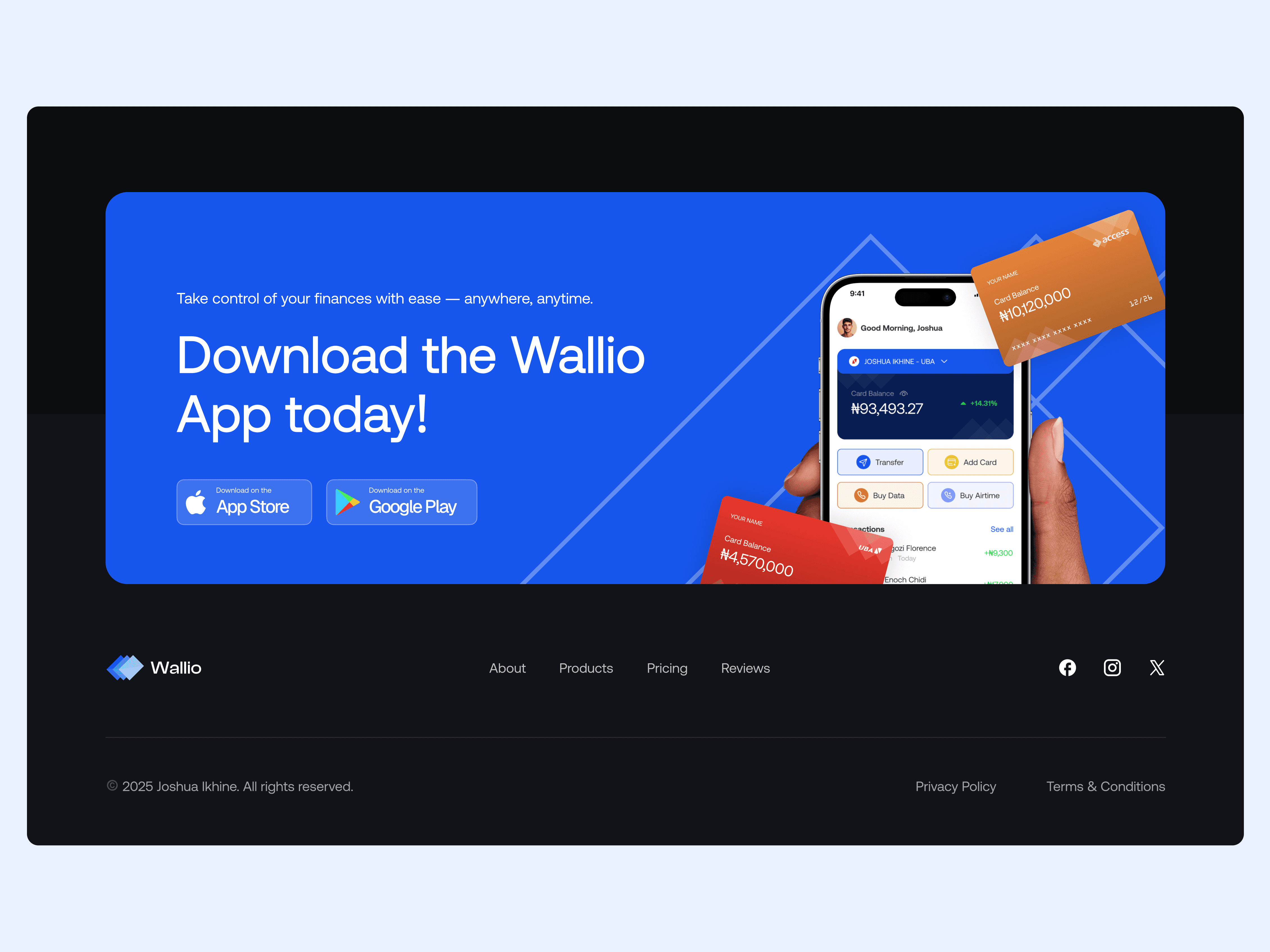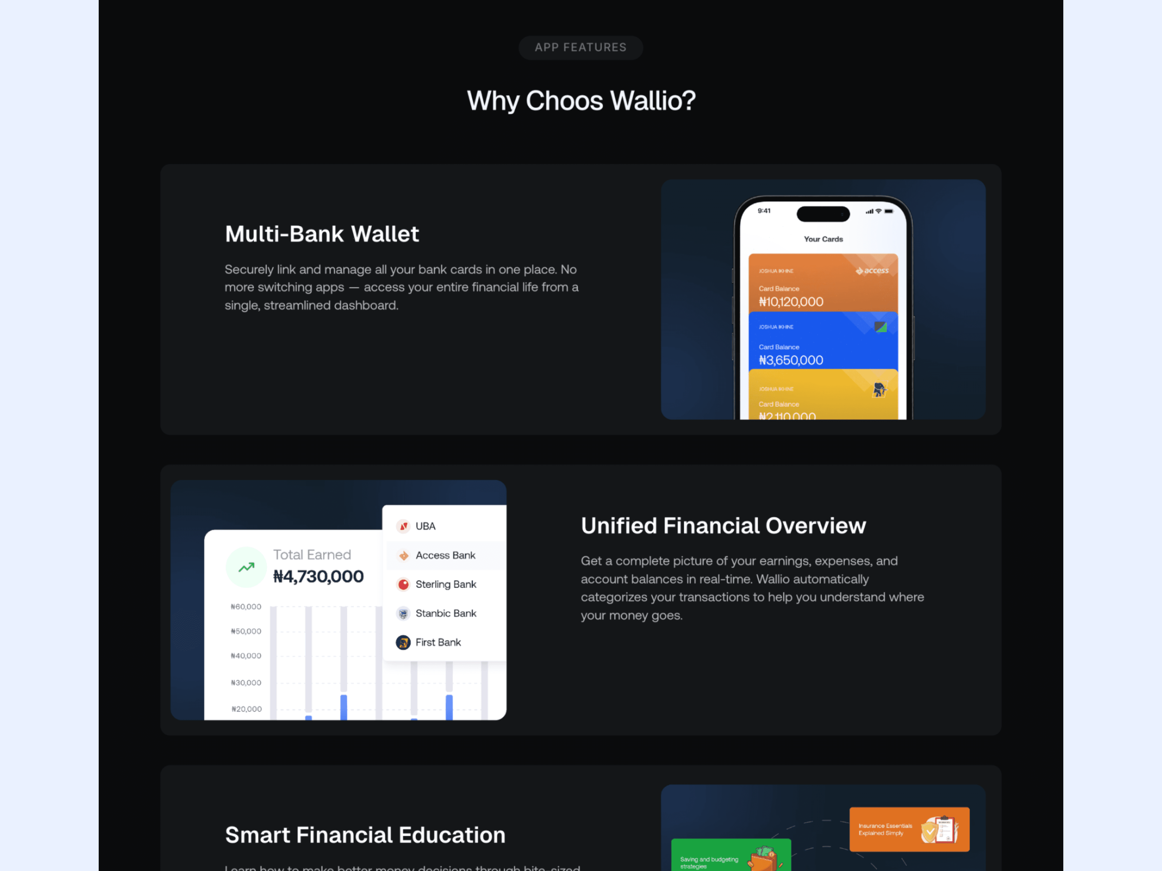 Eye-catching Hero Section: A bold, engaging introduction with clear messaging and visuals designed to instantly communicate Wallioβs core benefit β financial control in one app.