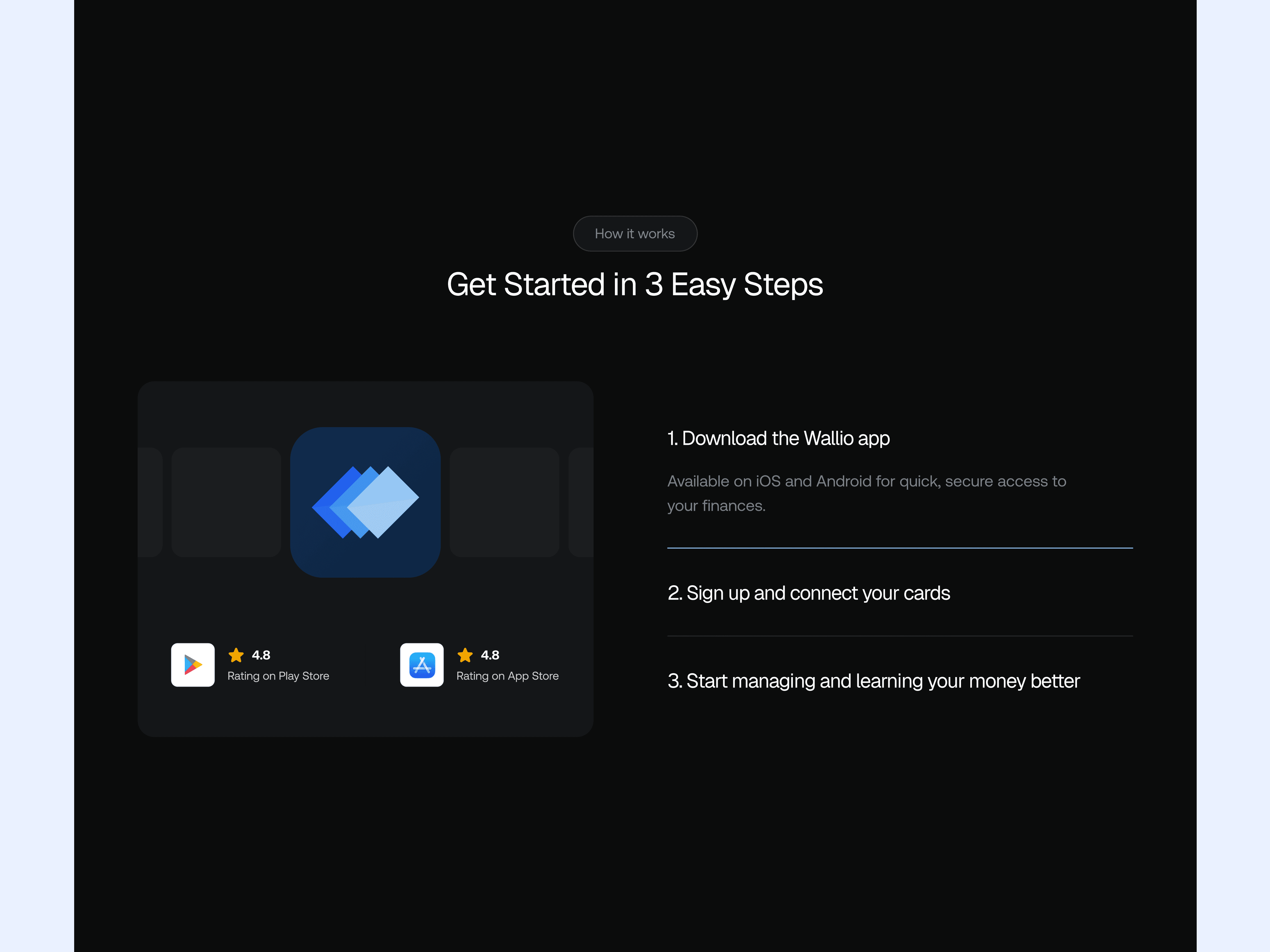 How It Works: A simple, step-by-step breakdown of how users can get started with Wallio, designed to remove friction and encourage conversion.
